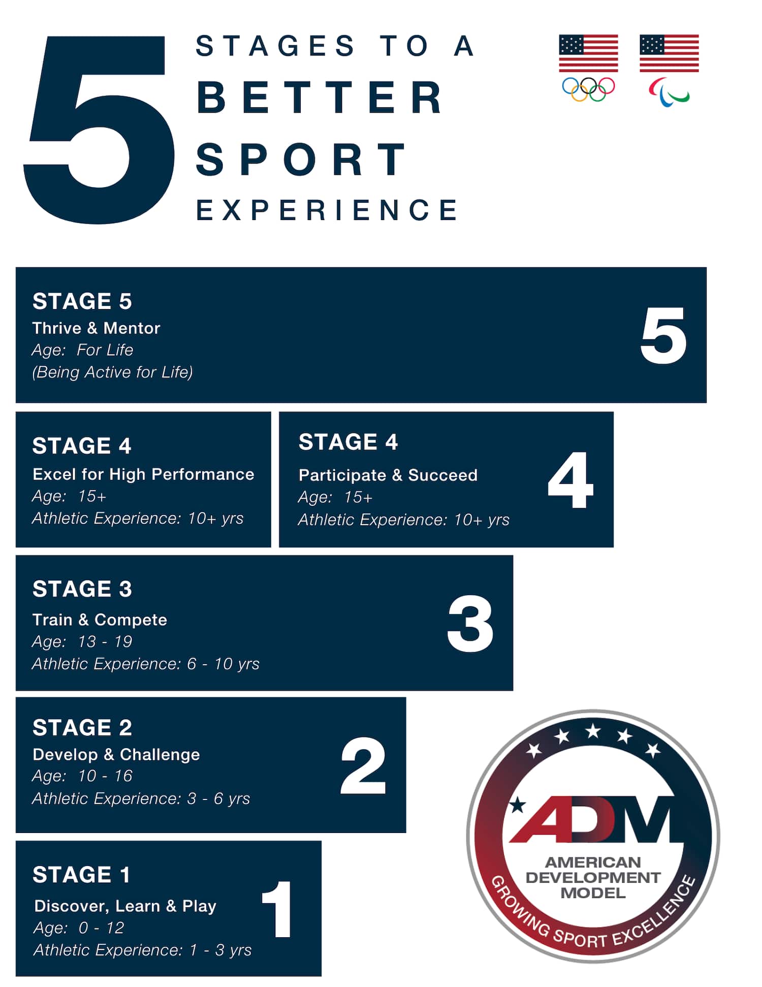 The ADM is a visual concept designed to help guide consumers and NGBs toward building and delivering programs that are focused on the individual athlete. The visual model illustrates age-appropriate expectations and concepts for each stage of development.