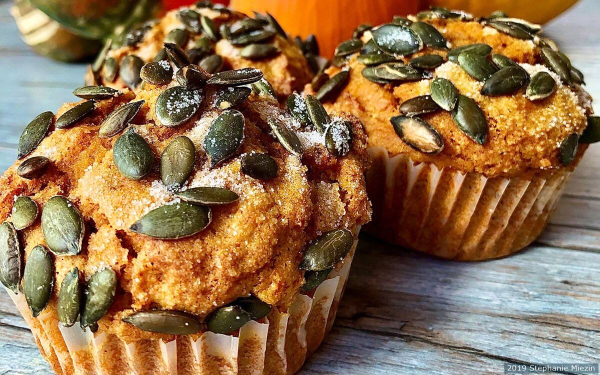 - Line muffin tins with papers. Evenly divide batter among tins. Sprinkle pepitas over batter, lightly pressing in if needed. Sprinkle sugar over muffins.