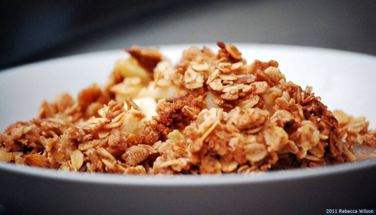 - To make base and top oat layer: combine oats, flour, and sugar in a bowl, make a well in the center, and add margarine and water. Mix with a knife until ingredients are evenly moistened