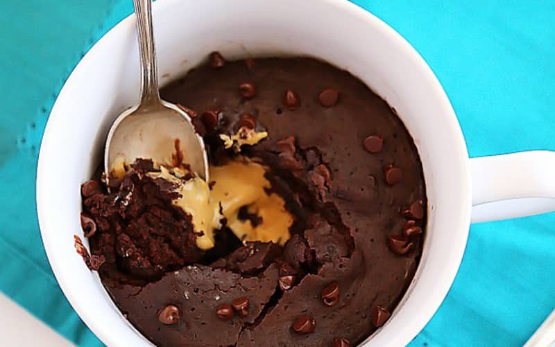 - Place peanut butter in small, microwave-safe bowl and heat in microwave for about 15 seconds. Drizzle on top of mug cake and enjoy!