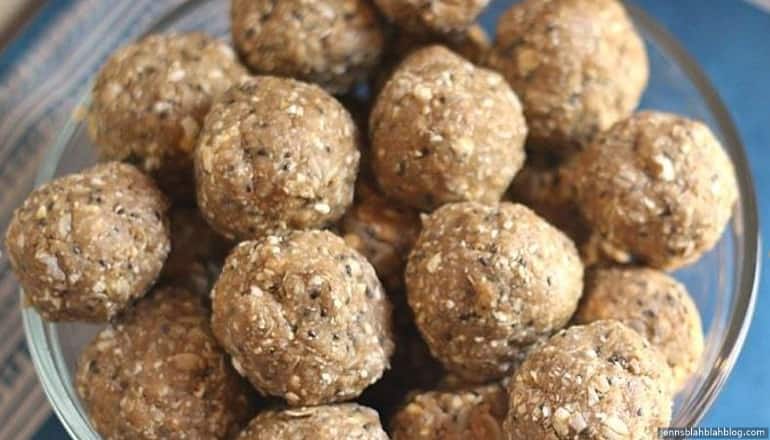 These balls are rich in iron, which helps produce red blood cells to keep your body efficient at delivering oxygen to muscles. Additionally, the fiber in the oats and healthy fats in the peanut butter will keep you feeling full longer.