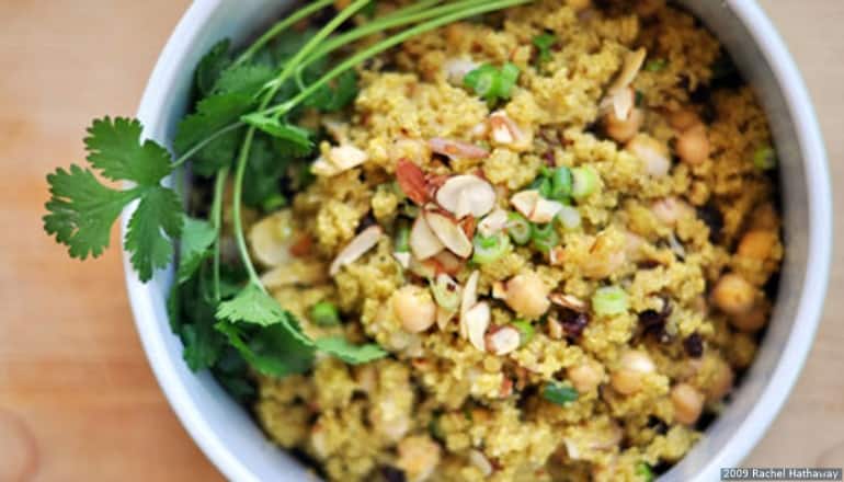 - Add apples, curry powder and quinoa. Continue to cook, stirring until well- incorporated, about 2 minutes.