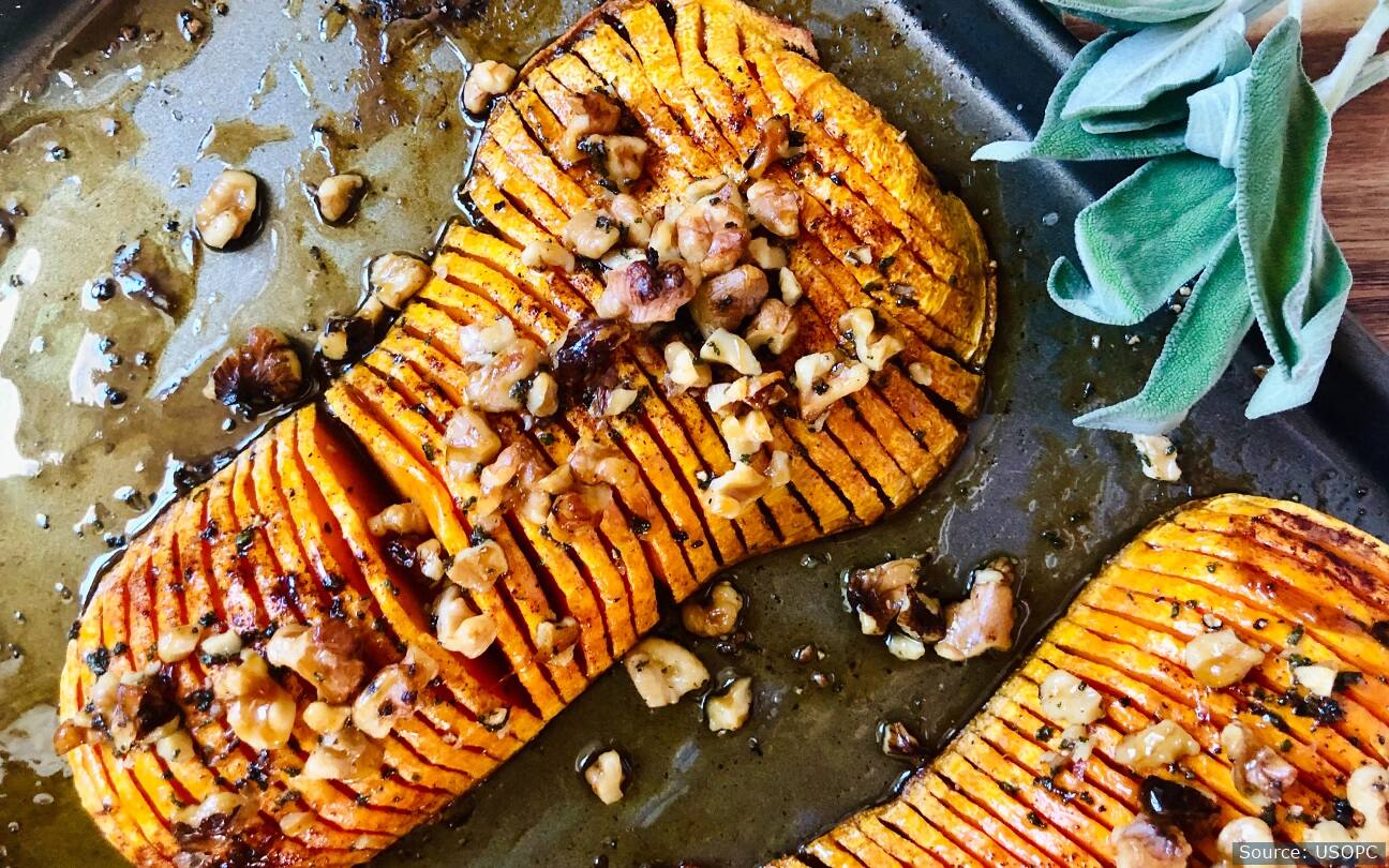 - Remove squash from the oven. Spoon the the maple walnut mixture over the squash and into the cuts. Bake again for about 10- 15 minutes, or until squash is tender throughout.