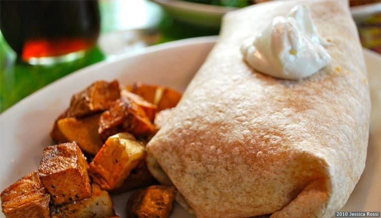 - Combine all ingredients on warmed tortilla and roll into burrito.