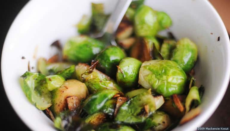 Save time by purchasing pre-cut Brussels sprouts and store-bought reduced balsamic vinegar. Add a piece of lean protein and a scoop of brown rice to make this a complete meal. Make this dish lighter by using Canadian bacon in place of thick-cut bacon.