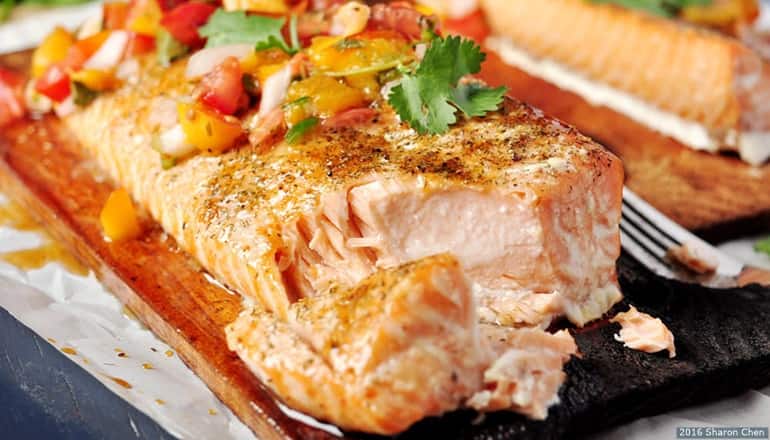 Salmon is high in omega-3 fatty acids, which are important for heart and brain health as well as countering inflammation. Tomatoes are rich in lycopene, which has been shown to be protective against a number of cancers. Vitamin C-rich salsa and pico de gallo will enhance iron absorption from the salmon.