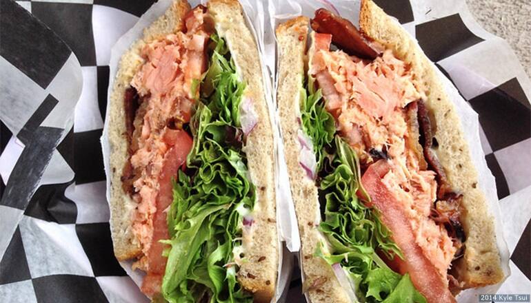 Substitute turkey bacon for a leaner, kosher option. Chose gluten free bread for a gluten free option. Use an oil based mayo mixed with Sriracha and minced garlic cloves for a spicy home-made aioli, or skip Sriracha for a non-spicy aioli. Grill salmon if desired. Salt tomatoes and avocados to enhance flavor.