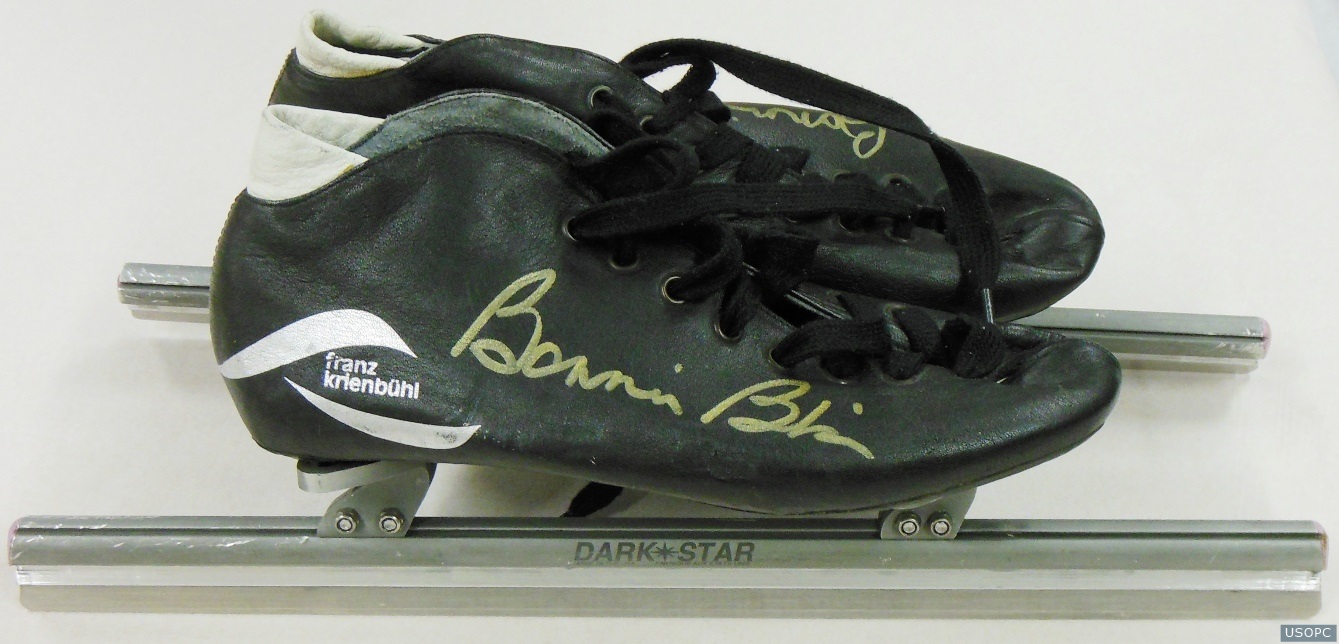 A pair of skates signed by five-time Olympic speedskating champion Bonnie Blair