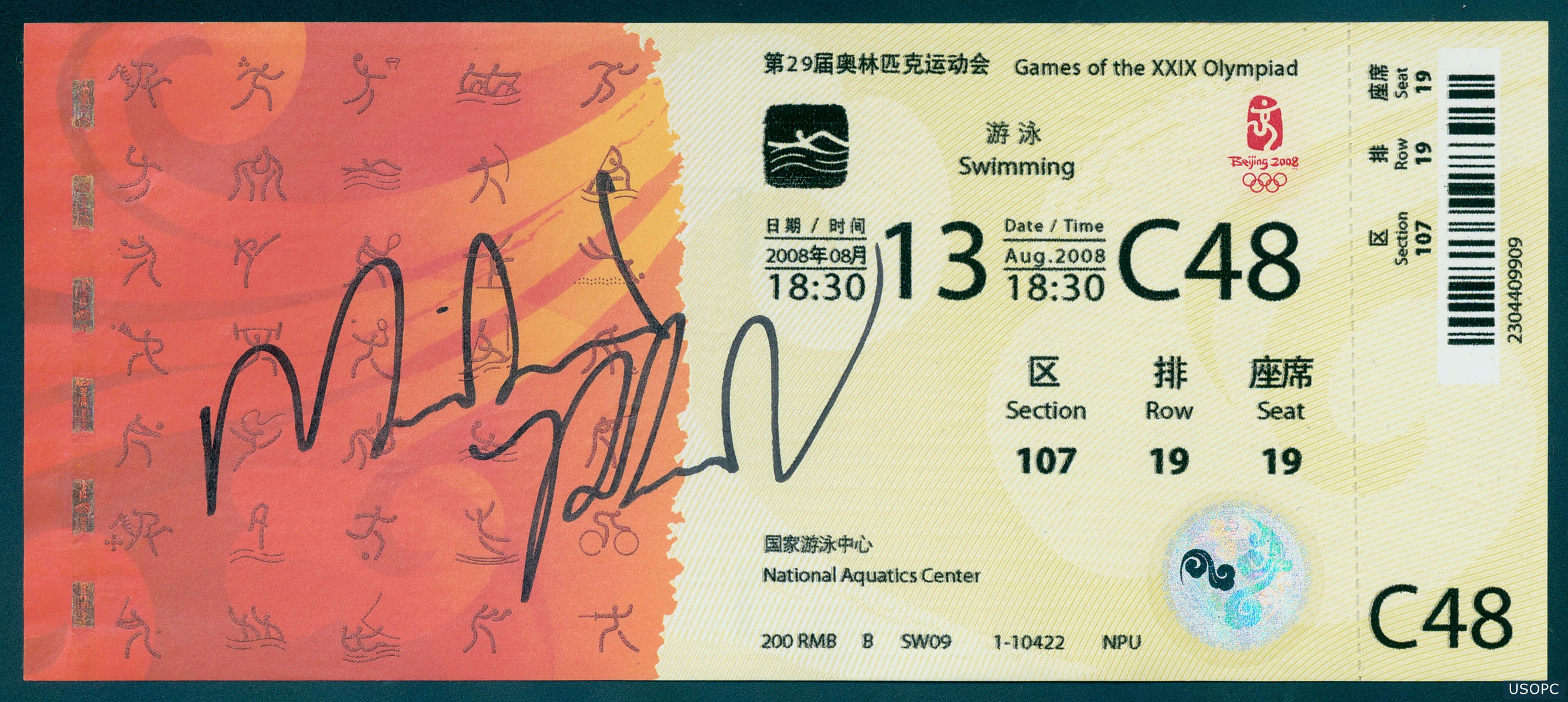 A ticket to swimming at the Olympic Games Beijing 2008 signed by Michael Phelps, who that day won gold in both the 200-meter butterfly and 4x200-meter freestyle