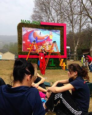 After the treasure hunt, the teams must complete several activities. Walking on two planks requires teams to communicate, bouncing a tennis ball on a drum held by strings requires teams to work in unison, and picking up water bottles without touching specific areas of the ground requires creativity and ingenuity.