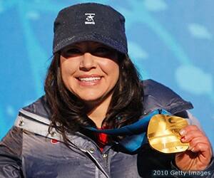 | Gold medalist Alana Nichols celebrates during the medal ceremony for the women's sitting giant slalom for the Vancouver 2010 Paralympic Winter Games. |