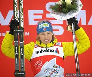 | Kikkan Randall celebrates at the podium after winning the women's 3.1-kilometer free individual prologue at DKB Ski Arena on Dec. 29, 2012 in Oberhof, Germany. |