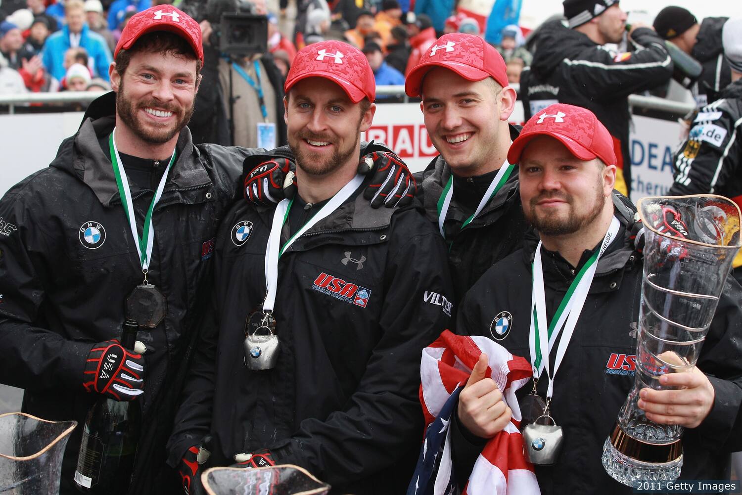 | Pilot Steven Holcomb (far right) celebrates winning the bronze medal with his teammates Steve Langton (far left), Justin Olsen (second from left) and Curt Tomasevicz after the final run of the men's four-man bobsled world championship on Feb. 27, 2011 in Koenigssee, Germany. |