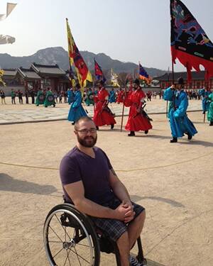 | Taylor Lipsett explores Gyeongbokgung Palace prior to the 2013 IPC Sledge Hockey World Championships in April 2013. |