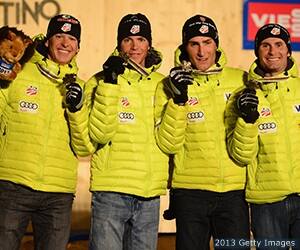 | Bill Demong, Todd Lodwick, Bryan Fletcher and Taylor Fletcher pose with their bronze medals for the Nordic combined team 4x5km at the FIS Nordic World Ski Championships on Feb. 24, 2013 in Val di Fiemme, Italy. |