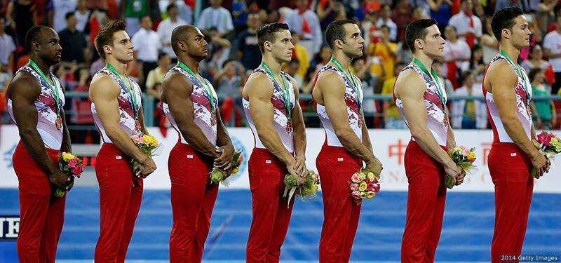 NANNING, China, Oct. 7, 2014 – The U.S. Team rallied in the final two rotations to pull ahead of Great Britain and clinch the bronze medal in the team finals at the 2014 World Championships in Nanning, China. The U.S. Team earned a 270.369, edging out Great Britain at 269.170. China slipped by Japan to win the team gold, 273.369 to 273.269. Competition continues tomorrow with the women’s team finals at 7 p.m. local time/7 a.m. ET. U.S. fans may follow the action live at universalsports.com and usagymworlds.com.