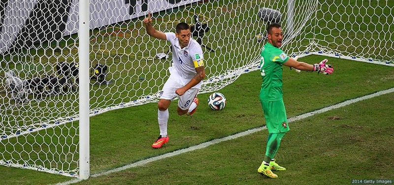 Clint Dempsey celebrates scoring Team USA's second goal against Portugal during the 2014 FIFA World Cup Brazil at Arena Amazonia on June 22, 2014 in Manaus, Brazil.