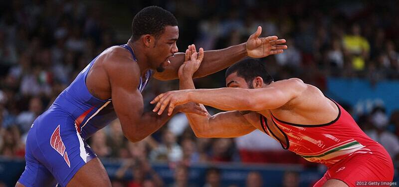 Jordan Burroughs (L) competes with Sadegh Saeed Goudarzi of the Islamic Republic of Iran in men's freestyle 74 kg. wrestling at the London 2012 Olympic Games at ExCeL on Aug. 10, 2012 in London.