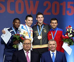 | (L-R) Daryl Homer (silver), Alexey Yakimenko of Russia (gold), Max Hartung of Germany (bronze) and Tiberiu Dolniceanu of Romania (bronze) stand atop the men's saber podium at the FIE Senior World Championships on July 14, 2015 in Moscow. |