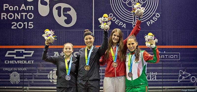 Olivia Blatchford (L, silver) and Amanda Sobhy (2nd L, gold) pose on the podium after the women's singles squash final at the Toronto 2015 Pan American Games on July 13, 2015 in Toronto.