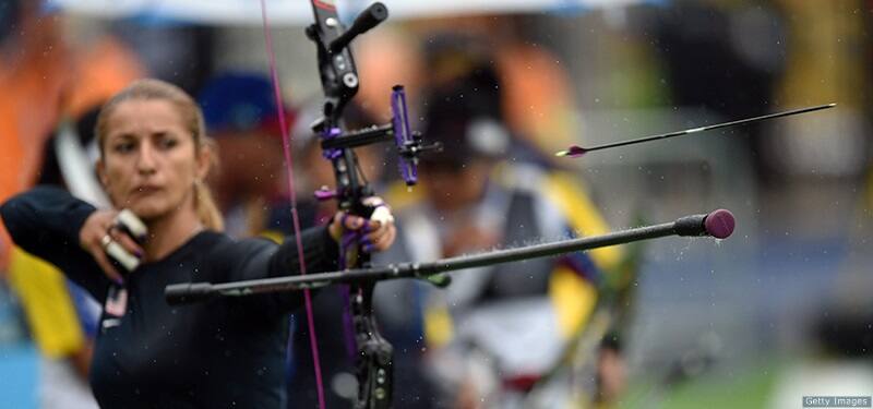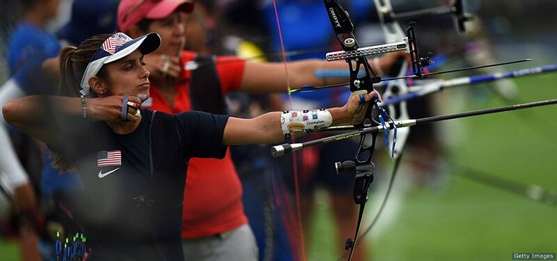 Khatuna Lorig shoots an arrow during the women's archery team competition for the bronze medal against Venezuela at the Toronto 2015 Pan American Games in Toronto on July 17, 2015.