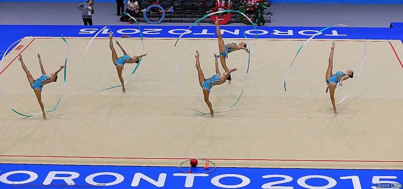 The U.S. rhythmic gymnastics team performs at the Toronto 2015 Pan American Games in Toronto on July 17, 2015.