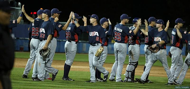 The U.S. baseball team congratulates each other at the end of the game against Canada at the Toronto 2015 Pan American Games on July 17, 2015 in Toronto.