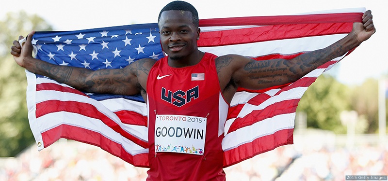 Marquise Goodwin holds the American flag after winning the silver medal in the men's long jump at the Toronto 2015 Pan Am Games on July 22, 2015 in Toronto.