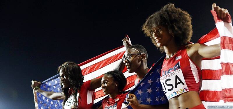 Shakima Wimbley, Kyra Jefferson, Shamier Little and Kendall Baisden celebrate winning gold in the women's 4x400-meter final at the Toronto 2015 Pan American Games at the Pan Am Athletics Stadium on July 25, 2015 in Toronto.