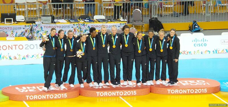 The U.S. women’s indoor volleyball team stands on the podium for a photo after winning gold at the Toronto 2015 Pan American Games on July 25, 2015 in Toronto.