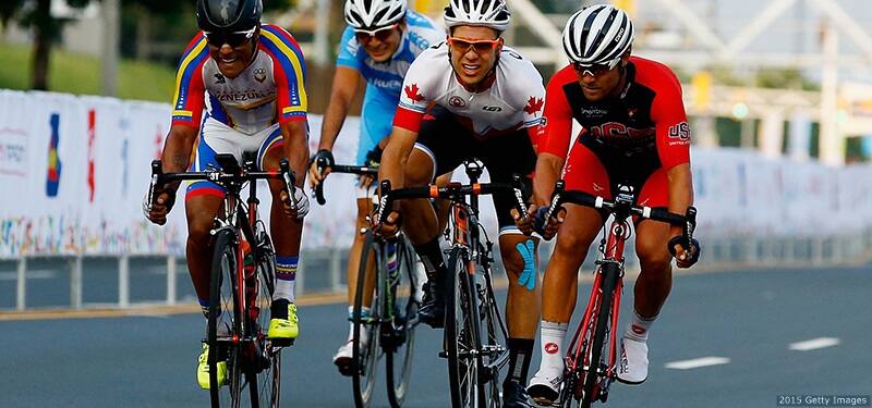 Eric Marcotte (R) competes in the men's cycling road race at the Toronto 2015 Pan American Games on July 25, 2015 in Toronto.