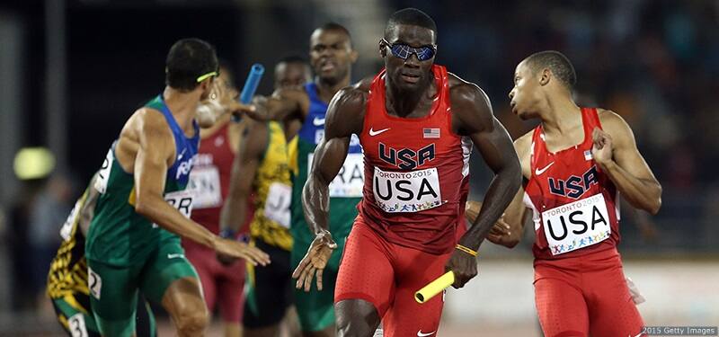 Kerron Clement runs the anchor leg in the men's 4x400-meter final at the Toronto 2015 Pan American Games at the Pan Am Athletics Stadium on July 25, 2015 in Toronto.