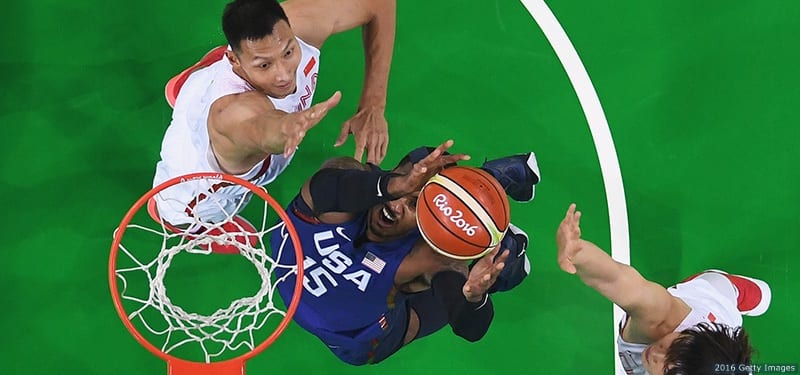 Carmelo Anthony goes to the basket against Jianlian Yi #11 of China in the men's preliminary round Group A match at the Rio 2016 Olympic Games at Carioca Arena 1 on Aug. 6, 2016 in Rio de Janeiro. Team USA beat China 119-62.