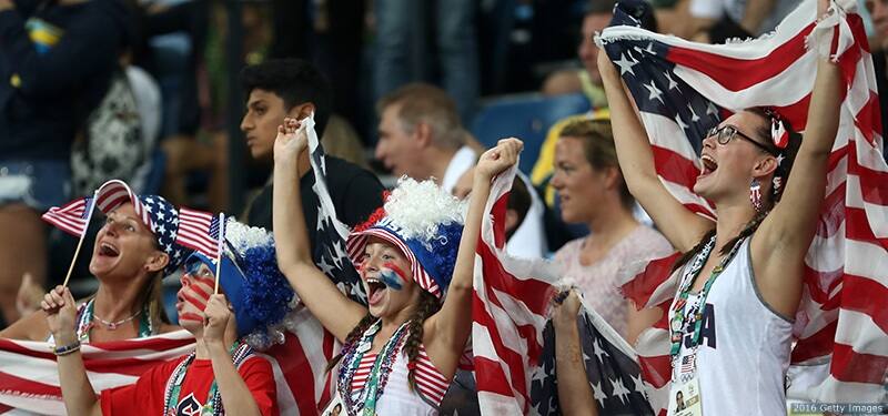Fans hold up United States flag at the men's preliminary round Group A match between the United States and China at the Rio 2016 Olympic Games at Carioca Arena 1 on Aug. 6, 2016 in Rio de Janeiro.