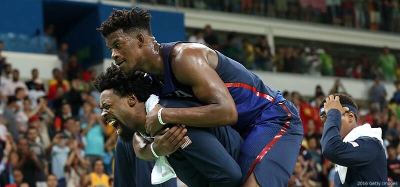 Jimmy Butler and DeAndre Jordan celebrate after defeating China at the Rio 2016 Olympic Games at Carioca Arena 1 on Aug. 6, 2016 in Rio de Janeiro. Team USA beat China 119-62.