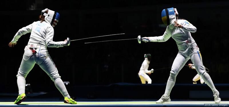 Courtney Hurley (L) in action against Yana Shemyakina (R) of Ukraine in the women's individual epee at the Rio 2016 Olympic Games at Carioca Arena 3 on Aug. 6, 2016 in Rio de Janeiro.