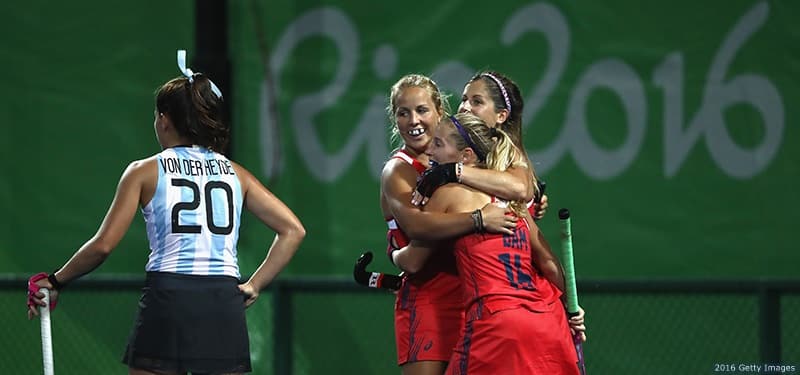 Katie Bam (#16), Kelsey Kolojejchick (#7) and Katie Reinprecht (#14) react to scoring a goal as Lucina von der Heyde (#20) of Argentina looks on during the women's Pool B match between the United States and Argentina at the Rio 2016 Olympic Games at the Olympic Hockey Centre on Aug. 6, 2016 in Rio de Janeiro. The U.S. beat No. 2-ranked Argentina 2-1.