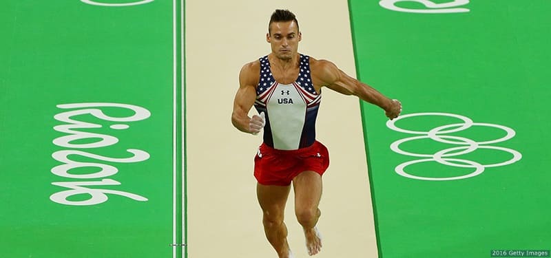 Sam Mikulak competes on the vault in the men's gymnastics qualification at the Rio 2016 Olympic Games at Rio Olympic Arena on Aug. 6, 2016 in Rio de Janeiro.