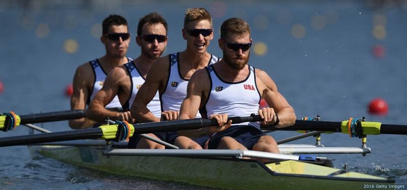 (L-R) Robin Prendes, Anthony Fahden, Edward King and Tyler Nase compete in the lightweight men's four at the Rio 2016 Olympic Games at the Lagoa Stadium on Aug. 6, 2016 in Rio de Janeiro.