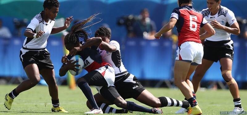 Victoria Folayan is tackled in the women's rugby match between the United States and Fiji at the Rio 2016 Olympic Games at Deodoro Stadium on Aug. 6, 2016 in Rio de Janeiro.