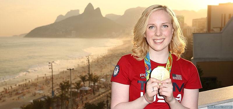 Olympic champion Ginny Thrasher visits the USA House at Colegio Sao Paulo after winning gold in the women's 10-meter air rifle final on Aug. 6, 2016 in Rio de Janeiro.