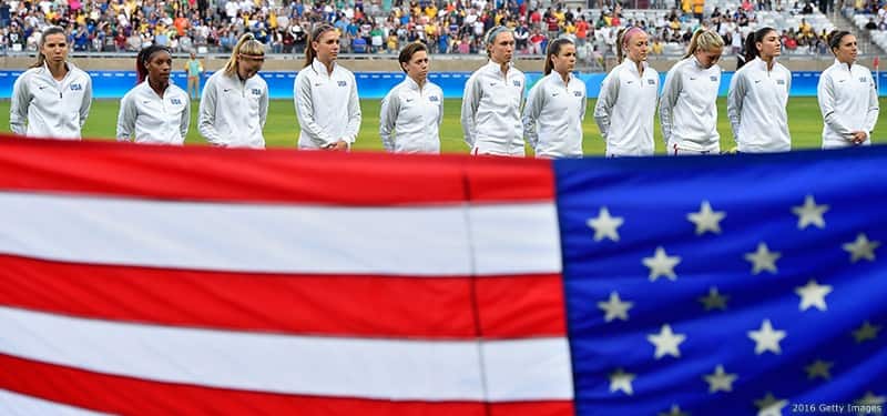 The U.S. women's soccer team gathers before the women's Group F first-round match between the United States and France at the Rio 2016 Olympic Games at Mineirao Stadium on Aug. 6, 2016 in Belo Horizonte, Brazil.