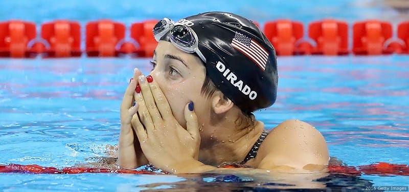Maya Dirado celebrates winning silver in the final of the women's 400-meter individual medley at the Rio 2016 Olympic Games at the Olympic Aquatics Stadium on Aug. 6, 2016 in Rio de Janeiro.