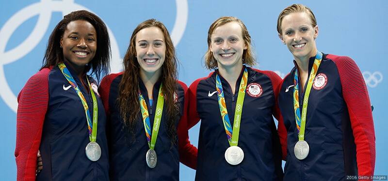 Silver medalists Simone Manuel, Abbey Weitzeil, Dana Vollmer and Kate Ledecky pose at the medal ceremony for the final of the women's 4x100-meter freestyle relay at the Rio 2016 Olympic Games at the Olympic Aquatics Stadium on Aug. 6, 2016 in Rio de Janeiro.