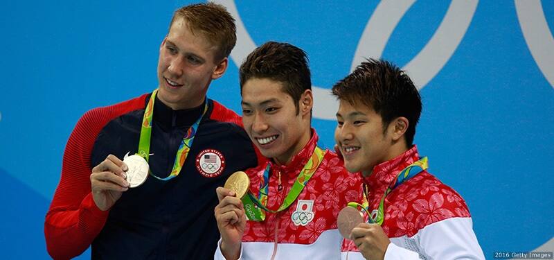 (L-R) Silver medalist Chase Kalisz , gold medal medalist Kosuke Hagino of Japan and bronze medalist Daiya Seto of Japan pose at the medal ceremony for the final of the men's 400-meter individual medley at the Rio 2016 Olympic Games at the Olympic Aquatics Stadium on Aug. 6, 2016 in Rio de Janeiro.