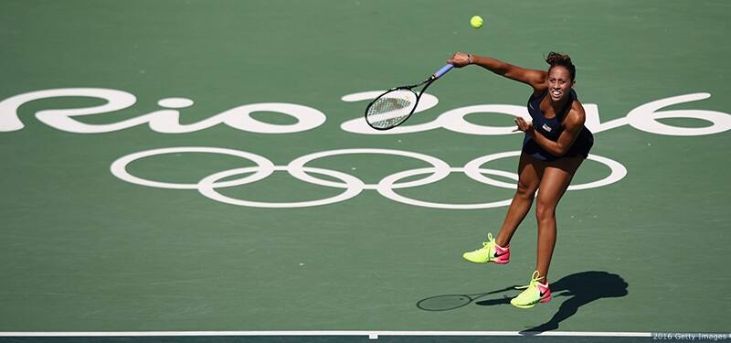 Madison Keys serves in her match against Danka Kovinic of Montenegro in the women's first round at the Rio 2016 Olympic Games at the Olympic Tennis Centre on Aug. 6, 2016 in Rio de Janeiro. Keys beat Kovinic 2-0.