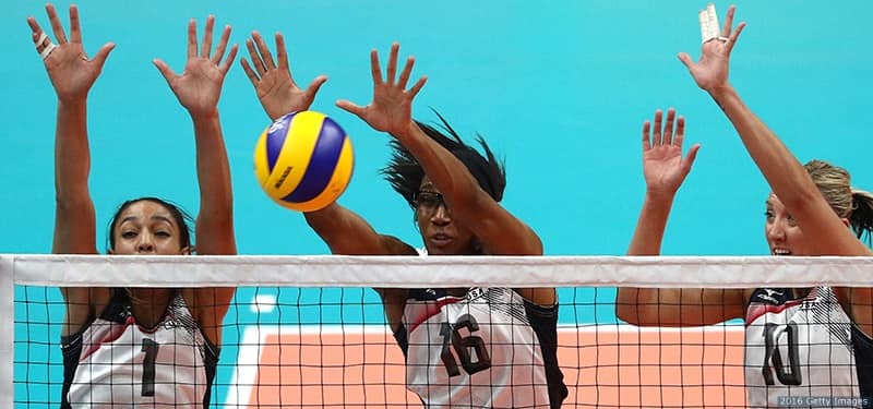 Foluke Akinradewo spikes the ball past Stephanie Enright of Puerto Rico at the women's preliminary Pool B match between the United States and Puerto Rico at the Rio de Janeiro Olympic Games at Maracanzinho on Aug. 6, 2016 in Rio de Janeiro.