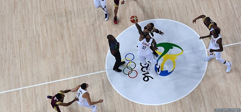 DeMarcus Cousins jumps for the opening ball against Venezuela at the Rio 2016 Olympic Games at the Carioca Arena 1 on Aug. 8, 2016 in Rio de Janeiro.