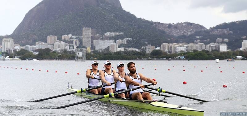 Henrik Rummel, Matthew Miller, Charles Cole and Seth Weil in action in the men's four repechage at the Rio 2016 Olympic Games at Lagoa Stadium on Aug. 8, 2016 in Rio de Janeiro.