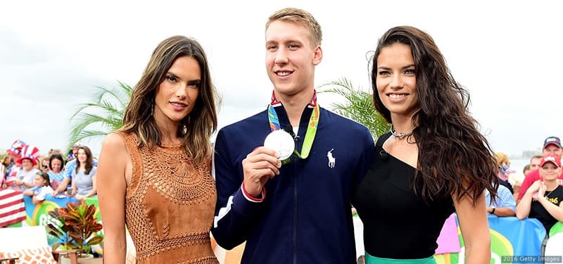 (L-R) Model Alessandra Ambrósio, swimmer Chase Kalisz and model Adriana Lima pose for a photo on the NBC Today Show set on Copacabana Beach on Aug. 8, 2016 in Rio de Janeiro.